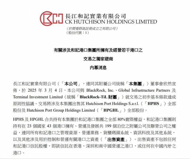 公告还强调,出售资产不包括任何和记港口集团信托股权,即该信托在中国香港、深圳营运之港口,或任何在中国内地之港口。
