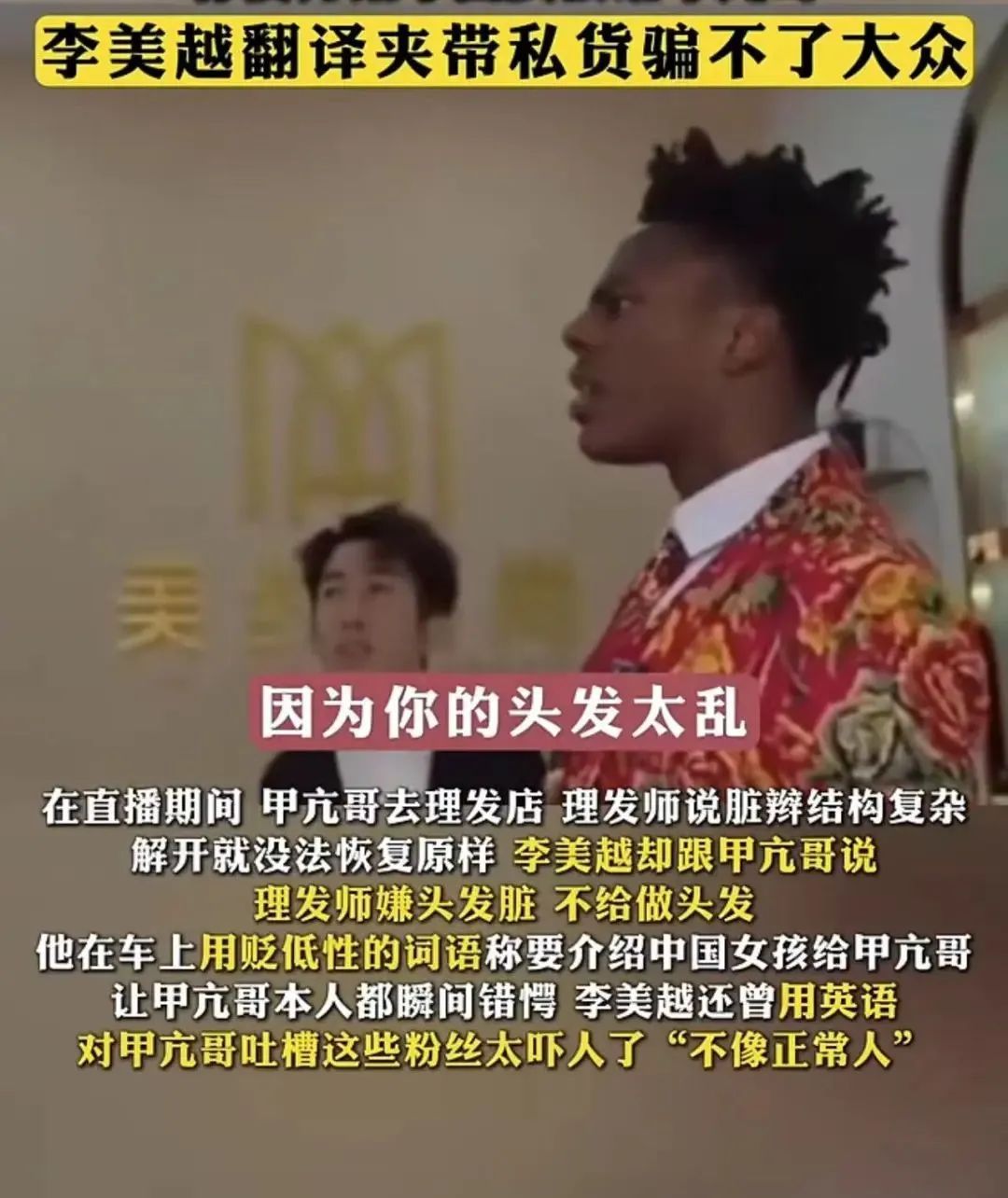 在直播期间,“甲亢哥”去理发店,理发师说脏辫结构复杂,解开就没法恢复原样,李美越却跟“甲亢哥”说理发师嫌头发脏,不给做头发。他还在车上用贬低性的词语称要介绍中国女孩给“甲亢哥”,用英语对“甲亢哥”吐槽粉丝太吓人了,“不像正常人”。