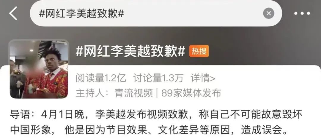 4月1日晚,李美越发布视频致歉,称自己不可能故意毁坏中国形象,他是因为节目效果、文化差异等原因,造成误会。他还提到在理发店时的表现不佳,给理发师和店铺带来了尴尬。